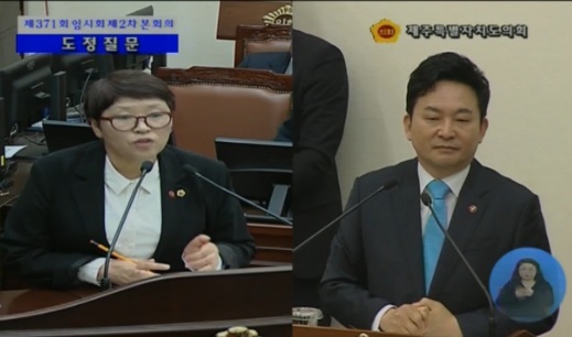9일 제371회 임시회 본회의가 오전 10시 열린 가운데 고은실 의원이 원희룡 지사를 상대로 도정질의에 나섰다.
