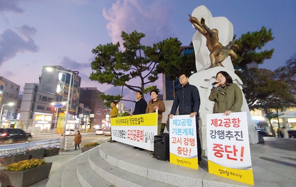 이날 정당 연설회에는 고병수 위원장을 비롯한 도당 운영위원들이 연사로 나서 제2공항에 추진의 문제점과 공론화의 필요성을 주장했다.
